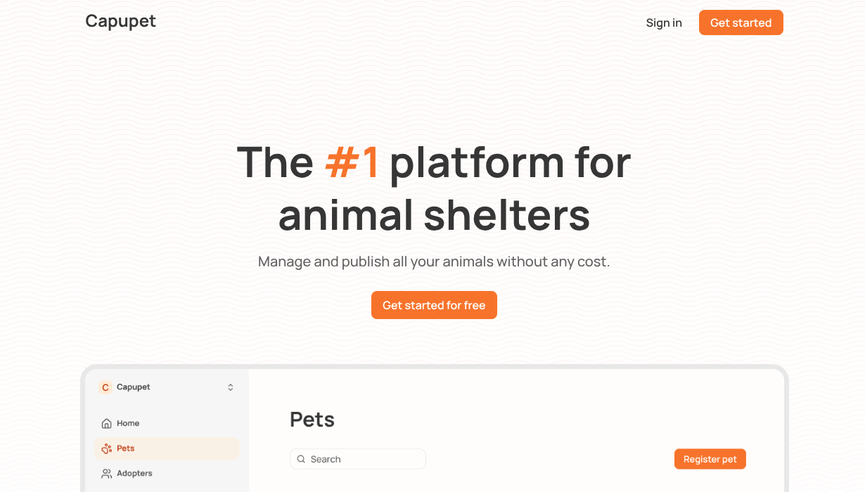 An all-in-one tool for animal shelters, completely free. Shelters can manage and publish pets, register prospects, tasks and more.