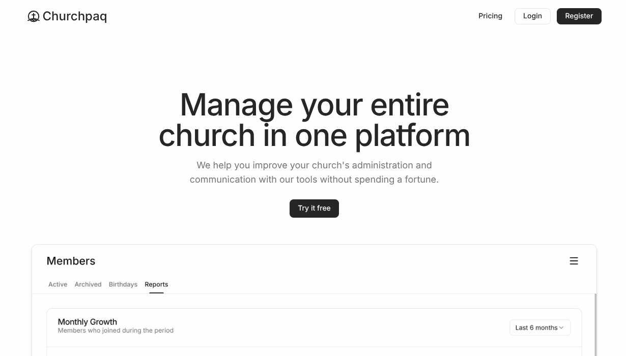 An all-in-one SaaS for churches. It manages members, events, website, blog, finances and inventory. Supports collaborative administration in a unified platform.